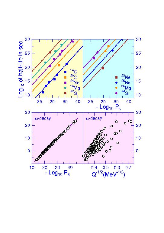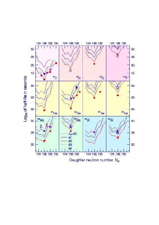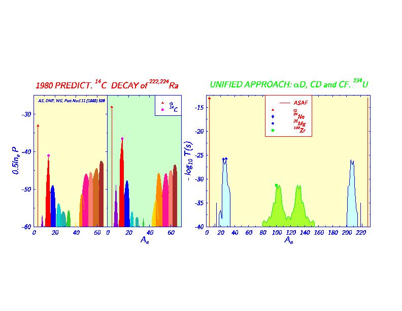 Figure 6: Comparison of Experimentally Confirmed Half-lives with Predictions within Analytical Superasymmetric Fission Model (ASAF) The measured halflives, ranging from 10 to the power 11 to 10 to the power 26 sec, are in good quantitative agreement with the predicted halflives and branching ratios.