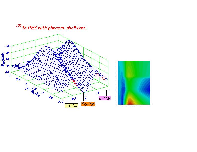 Figure 2: Potential Energy Surfaces of 106-Te showing for the first time the alpha valley with the detailed landscape around the saddle-point along the alpha valley.