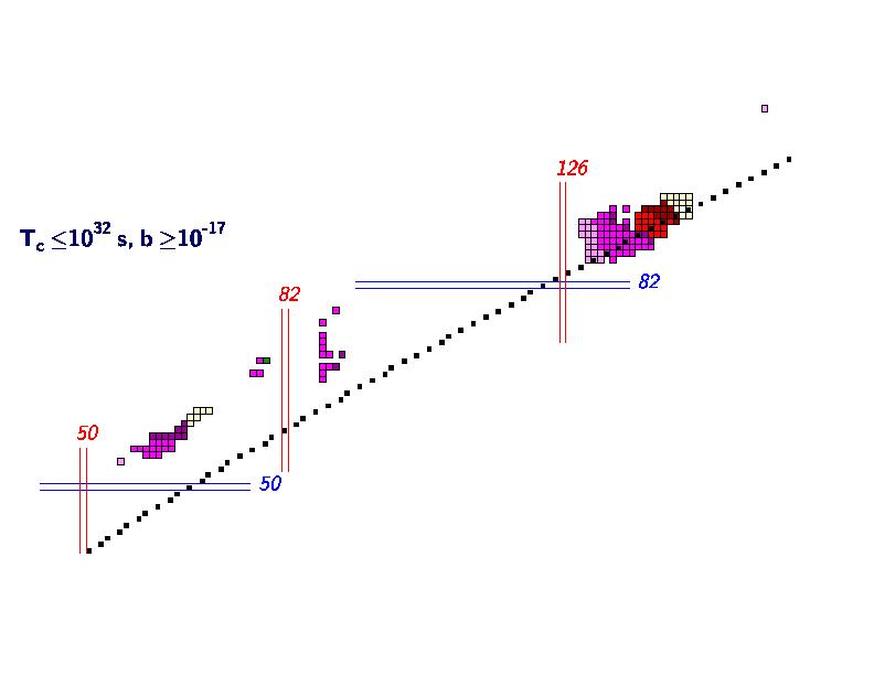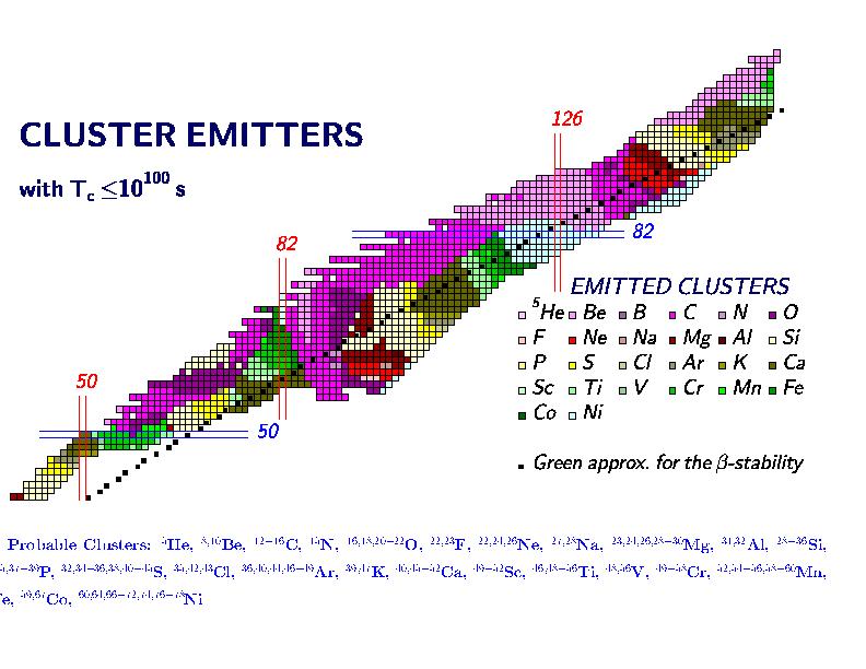 Figure 3: Nuclear Chart of Cluster Emitters including very long half-lives (Tc) and small branching-ratios (b) relative to alpha-decay