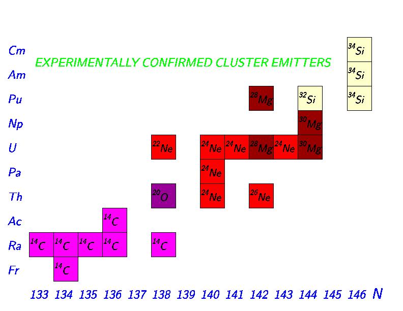 Figure 4: Nuclear Chart of Cluster Emitters selcted to posses measurable half-lives and branching-ratios relative to alpha-decay