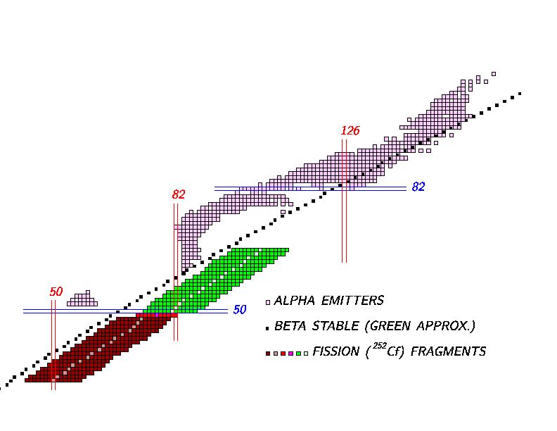 Figure 9: The Nuclear Chart of Experimentally Observed Alpha Emitters and of the 252-Cf fission fragments